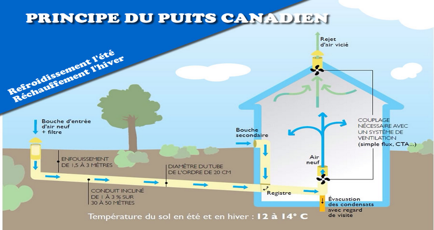 Le puits canadien est un système de ventilation naturelle qui permet le renouvellement de l’air dans les pièces d’un logement. Il s’agit d’une canalisation enterrée sous le terrain de la maison et dont une ouverture ressort quelques mètres plus loin dans le jardin. Faisant usage de l’inertie thermique, l’air insufflé dans l’habitat est toujours maintenu à une température agréable. En effet, le sous-sol ne subit pas l’influence des saisons à l’inverse de l’air de la surface. Ainsi, en été, on obtient sous terre une température constante de 20°C et, en hiver, on avoisine les 14°C, selon les régions. Enterré à une profondeur comprise entre 1,5 m et 2,5 m, le puits canadien adapte la température de l’air extérieur pendant son voyage dans le tuyau jusqu’à l’intérieur de la maison.